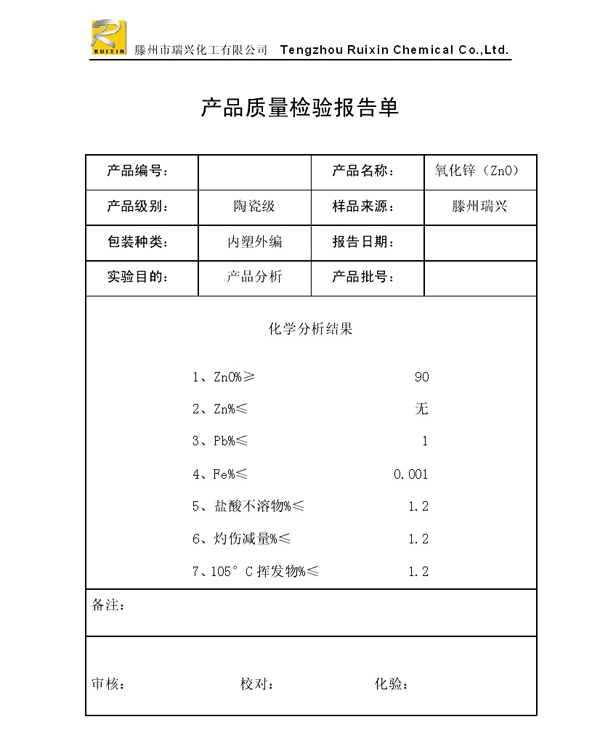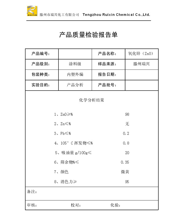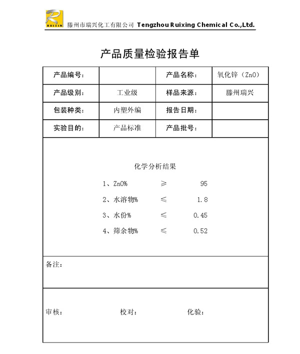 瑞興化工有限公司是生產(chǎn)氧化鋅的重點(diǎn)企業(yè),于2008年通過ISO9001:2008質(zhì)量管理體系認(rèn)證。“瑞興”牌氧化鋅在國內(nèi)擁有較大穩(wěn)定的市場,并遠(yuǎn)銷東南亞、中東、中南美等國家和地區(qū),在國內(nèi)外享有較高聲譽(yù)。